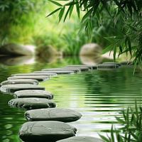 Te midden van een weelderige Zen-tuin leiden zorgvuldig geplaatste stenen over het kalme water en nodigen de kijker uit op een reis van zelfontdekking en innerlijke rust. De groene bamboebladeren die zachtjes over het water hangen versterken het gevoel van sereniteit en vrede. De zachte golvingen en het delicate spel van licht en…