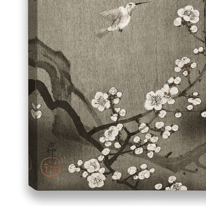 Aziatische prent met pruimenbloesem, een witte maan en een Kolibrie vogeltje. Bewerkte Mixed media, het originele werk zonder vogeltje en in een andere kleurstelling was van Ohara Koson, een Japanse schilder en prentontwerper uit de late 19e en vroege 20e eeuw