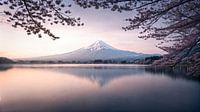 Deze foto toont een ongeëvenaard tafereel dat rust en harmonie tot in de perfectie vastlegt. De met sneeuw bedekte berg Fuji rijst majestueus op in de achtergrond, omlijst door delicaat bloeiende kersenbomen. De roze bloesems staan in zacht contrast met de koele pastelkleuren van de lucht, die de dageraad aankondigt. Het gladde oppervlak van het meer weerspiegelt het silhouet van de bergen en de lucht, waardoor een bijna symmetrische compositie ontstaat.