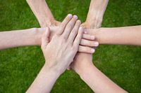 Zes armen verenigd met handen op elkaar met groen gras als achtergrond. De handen vormen een cirkel. De mensen houden hun platte handen met de palm naar beneden op elkaar. De blote armen en handen maken contact met elkaar. Het staat symbool voor samen, eenheid, teamwork, contact, groep, verenigd, vertrouwen, band, overeenkomst vriendschap, vreugde, support.
