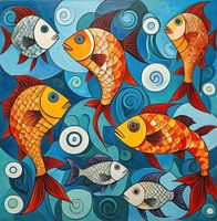 Kleurrijke vissen zwemmen tegen een helderblauwe achtergrond, waardoor een levendige aquatische scène ontstaat. De vissen zijn afgebeeld in rode en oranje tinten met complexe schubbenpatronen die diepte en contrast toevoegen aan de compositie.