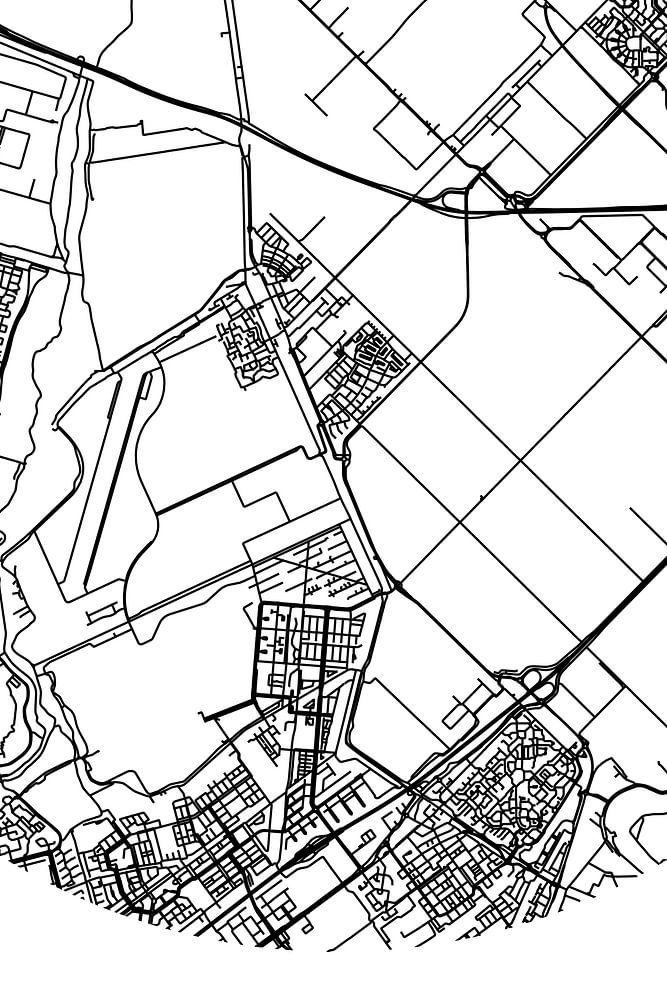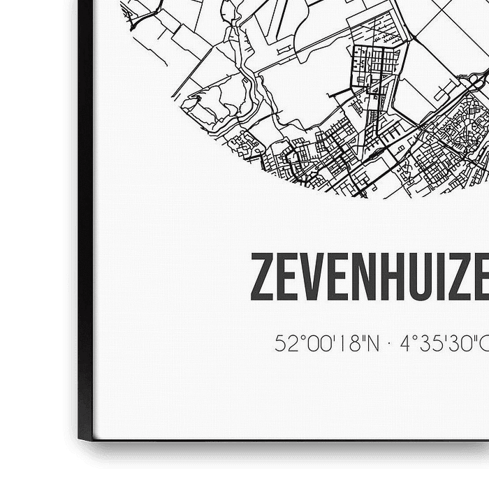 Zwart-witte landkaart, stratenplan of plattegrond van Zevenhuizen. Zevenhuizen is gelegen in de gemeente Zuidplas, provincie Zuid-Holland. Op de stadskaart zijn alle openbare wegen in Zevenhuizen opgenomen. Verder is de kaart voorzien van de coördinaten van het centrum van Zevenhuizen.