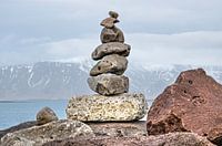 Close-up van een IJslandse cairn, ook wel steenmannetje genoemd, bestaande uit zeven gestapelde stenen.