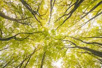 Zicht naar boven in een beukenbos met bruine bladeren op de heuvels in het natuurgebied Veluwezoom in Gelderland, Nederland.