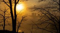 Tussen de bomen door gloort aan de andere kant van de Niagara Falls de Amerikaanse bebouwing. De zonsopgang geeft een sprookjesachtige sfeer. En het is nog zo stil ....