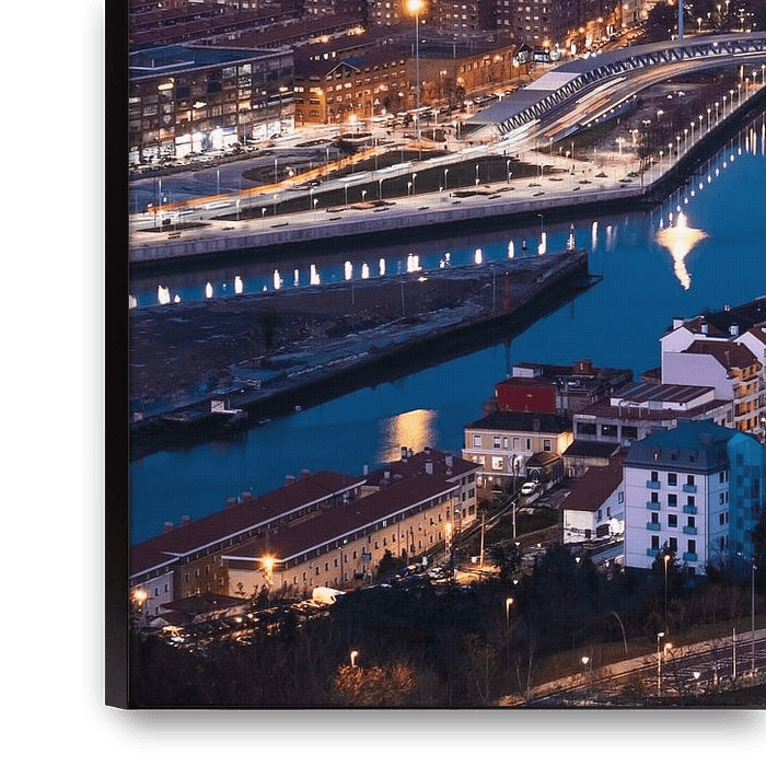 Vanaf een prachtig uitzichtpunt zie je hier Bilbao liggen - in het blauwe uurtje.