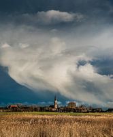 Het Friese plaatsje Cornwerd, vlak acht de IJsselmeerdijk, met een fraaie herfstlucht boven zijn zeer herkenbare kerktoren