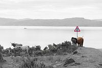 Een kleine kudde Highlander koeien geniet van het uitzicht op de Isle of Rona vanaf het schiereiland Applecross in de Highlands.