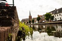 Zicht op de schippersgracht in Maarssen met in de verte de torenspits van de Heilig Hartkerk.