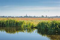 Op de achtergrond zie je de toren van de Maria Magdalenakerk boven de rest van Wormer uitsteken. Op de voorgrond zijn de Gele Lissen langs het water zichtbaar. Deze weerspiegelen in het stille water. In de lucht zie je 2 lepelaars overvliegen.