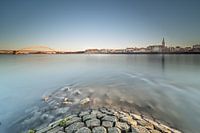 Zicht op Nijmegen over de Waal met in de verte de waalbrug. Zonsondergang.