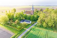 Zicht op Saaxumhuizen op de vroege ochtend net na zonsopkomst. Centraal in de foto de 13e-eeuwse Hervormde kerk van Saaxumhuizen.