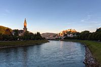Zicht op de stad Salzburg in Oostenrijk vanaf een de 'Müllner Steg' fiets- en loopbrug over de Salzach rivier. De ondergaande zon verlicht nog net Kasteel Hohensalzburg in het centrum van de stad en de torenspits van de Christuskirche (links).