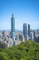 Taipei 101 is het hoogste gebouw van Taiwan die je hier tussen de vele andere gebouwen kunt zien aan de skyline van Taipei. De foto is gemaakt vanaf Elephant Peak, een bekend uitzichtpunt op de stad.