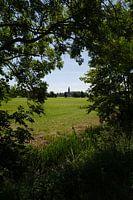 Door de bosschages heen is de RK kerk van Vogelenzang te zien.