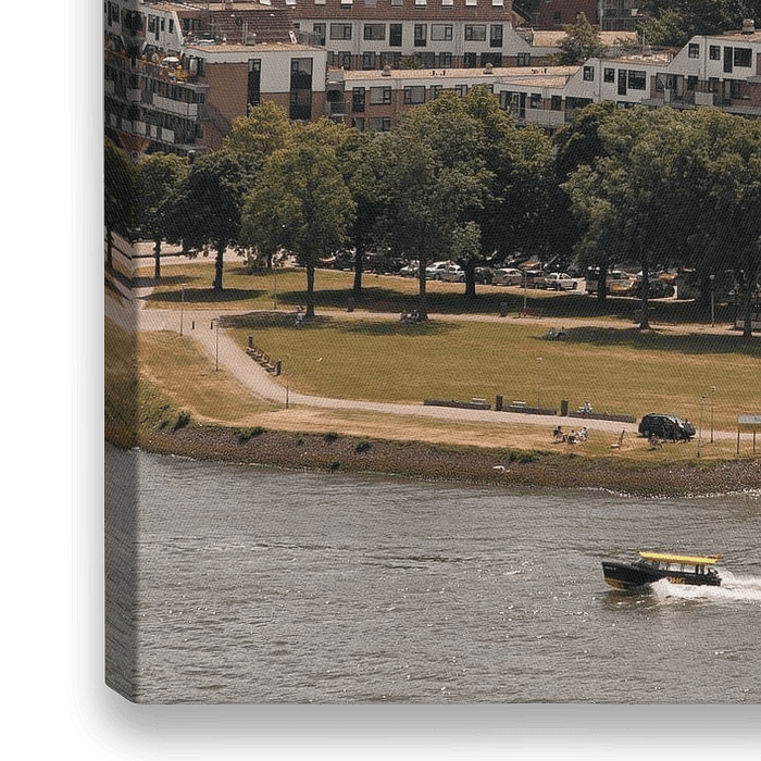Rotterdam-Zuid gezien vanaf de euromast. Als Rotterdams tintje een watertaxi die langsvaart