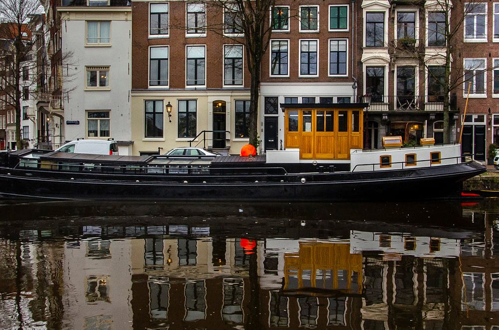 Ondanks het grauwe weer toch een kleurrijke foto van de grachtenpanden en een mooie reflectie .