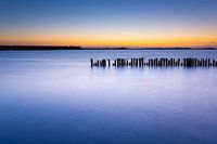 De Belterwijde, in de kop van Overijssel is elke dag anders. Door een lange sluitertijd sluit het water mooi aan op de wolkenloze lucht. De ondergaande zon zorgt voor een mooi kleurcontrast en de paaltjes in het water zorgen voor een mooi strak lijnenspel.
