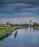 Zicht op de skyline van Leeuwarden gespiegeld in het nagenoeg stilstaande water van het van Harinxmakanaal op de voorgrond.