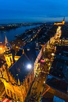 Zicht op de Oudestraat winkelstraat van Kampen aan de rivier de IJssel in Overijssel, Nederland. De lichten van de winkelstraat Oudestraat leiden naar de verlichte kerk Bovenkerk op de achtergrond.