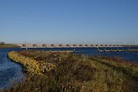 De Haringvlietdam op een zonnige dag gezien vanuit de haven van Stellendam