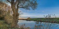 De sloot achter de IJsselmeerdijk bij het Friese Molkwerum gezien vanaf de walkant nabij de camping met een blauwe lucht op een windstille najaarsdag.