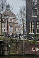Zicht op de Koepelkerk vanaf de Brouwersgracht in Amsterdam. Nog net tezien de huizen van de Singel, Ossenspooksteeg en de Koggestraat.