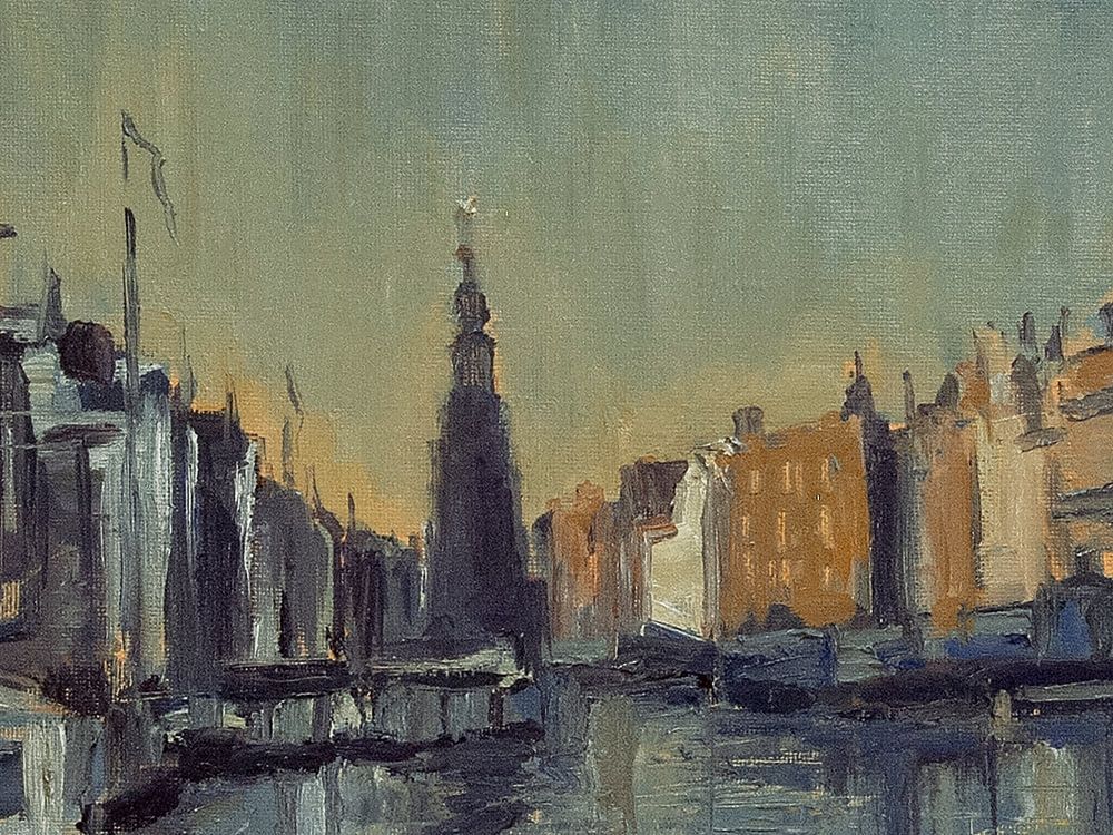 Kijkend over de Amstel zie ik de Munt. Een toren in Amsterdam. Het weer is mooi en zonnig. Ik moet snel schilderen want het licht verandert iedere 10 minuten.