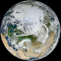Deze NASA-foto toont een prachtige satellietweergave van de aarde, waarbij een groot deel van het noordelijk halfrond zichtbaar is.