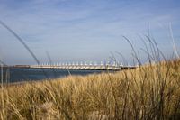 Blik door het duingras op de Oosterscheldekering, een afsluitbare stormvloedkering tussen Schouwen-Duiveland en Noord-Beveland, onderdeel van de Nederlandse Deltawerken.