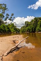 Zicht op de Suriname rivier en omliggend oerwoud Onder een blauwe lucht met stapelwolken bij het Kabalebo jungle camp, Suriname