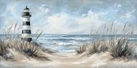 In dit kustlandschap wordt de blik getrokken naar een zwart-wit gestreepte vuurtoren aan de linkerkant van het doek. Hij staat stevig verankerd tussen duingras dat zich uitstrekt naar de golvende zee. Het pad van zand loopt van de voorgrond naar het water, tussen de grassen door. De zee toont een patroon van golven, schuimkoppen en horizonlijnen. Er is sprake van een spel tussen openheid en begrenzing: de duinen bieden beschutting, terwijl het water oneindigheid suggereert.