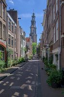 Vanuit de eerste Leliedwarsstraat in Amsterdam is de Westerkerktoren, ook wel liefkozend de 'Ouwe Wester' genoemd, goed te zien. Door het straatje tekent de schaduw speelse patronen. Al het groen voor de huizen maakt dit werk een lust voor het oog.