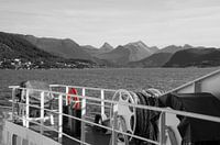 Zwartwitbeeld vanaf de ferry naar Solsnes met zicht op de bergen van het Romsdal in Noorwegen.
