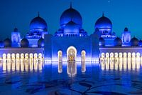 Zicht op de blauw verlichte Sheikh Zayed Grand Mosque in de avond in Abu Dhabi, Verenigde Arabische Emiraten