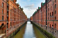 Uitzicht op de oude Speicherstadt in Hamburg met oude rode bakstenen gebouwen op een zonnige dag in de zomer
