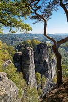 Zicht op de rotsen van Saksisch Zwitserland in het Elbezandsteengebergte vanaf de brug van de Bastei bij Rathen
