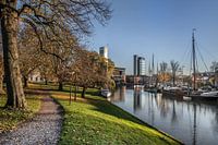Zicht op de Leeuwarder stadsgracht in de namiidagzon vanaf de Westerplantage en de twee dominante kantoortorens duidelijk zichtbaar.