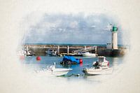 zicht op de vuurtoren van la Flotte vanaf het strand plage de l' Arnérault met boten op de zee op een zonnige zomerdag in waterverf