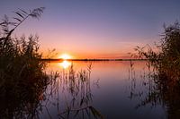 Zicht op zonsondergang vanuit de baai van Altmühlsee in de zomeravond met riet op de voorgrond