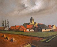 Impressionistisch zicht op een Vlaams dorp en weilanden met kerkje, huizen en boerdrijen. Olieverf op doek. Pieter Ringoot.