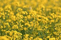 Zicht op een geel koolzaadveld. Gele bloesems stralen in verwarring. Landschapsopname