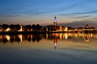 Zicht op hanzestad Kampen, het laatste zonlicht is verdwenen het blauwe uur is ingegaan. Kampen ligt er mooi bij aan de IJssel.
