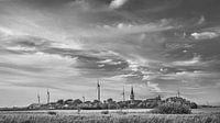 Zicht op het Friese dorpje Cornwerd vlak achter de IJsselmeer dijk in het Noord-Westen van de provincie en het herkenbare kerkje tussen de windmolens als klassiek baken.