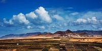 Zicht op het dorpje Soo op het Canarische eiland Lanzarote met de Noordelijke wand genaamd de "Risco de Famara" op de achtergrond