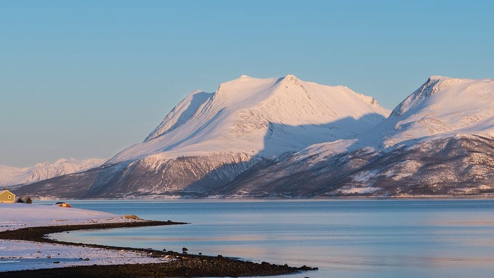Zicht op het eiland Senja in het poolgebied van Noorwegen met fjord en zee en bergen met sneeuw, Tromso Noorwegen
