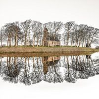Zicht op het kerkje van het Friese dorp Hijum, omzoomd door bomen en gespiegeld in het stilstaande water van de ijsbaan en bewerkt zodat het water wit is.