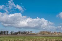Het Friese landschap in het noorden van de provincie met zicht op het kerkje van Waaxens en een stevige wolkenlucht.