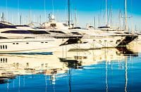 Mening van luxe motorjachten afgemeerd in jachthaven, maritieme nautische achtergrond