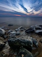 Zicht over het IJsselmeer, de zonsondergang bij Urk. De rotsen als voorgrond genomen.